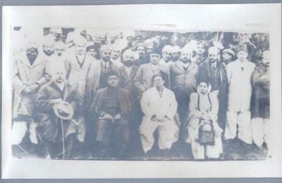الجلوس (يسار إلى يمين): صاحبزادة محمد خورشيد (first Pakistani Governor of the NWFP), نوابزادة لياقت علي خان (عاش 2 أكتوبر 1896 – 16 أكتوبر 1951) أول رئيس وزؤاء لپاكستان، نواب سير محمد فريد خان (Nawab of Amb) وبگوم رعناء لياقت علي خان (زوجة لياقت علي خان. دربند، Amb State, 1949.