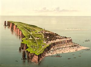 The island had no distinct name before the 19th century. It was often referred to by variants of the High German Heiligland ('holy land') and once even as the island of the Holy Virgin Ursula. Theodor Siebs summarized the critical discussion of the name in the 19th century in 1909 with the thesis that, based on the Frisian self-designation of the Heligolanders as Halunder, the island name meant 'high land' (similar to Hallig).[1] In the following discussion by Jürgen Spanuth, Wolfgang Laur again proposed the original name of Heiligland.[2] The variant Helgoland, which has appeared since the 16th century, is said to have been created by scholars who Latinized a North Frisian form Helgeland, using it to refer to a legendary hero, Helgi.[3][4] The discussion is complicated by a disagreement as to which of the listed names really refers to the island of Helgoland, and by a desire for the island still to be seen as holy today.[5]