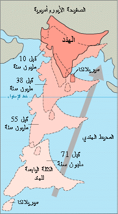قبل حوالي 225 مليون سنة، كانت الهند عبارة عن جزيرة ضخمة تقع بالقرب من الساحل الأسترالي، وفصل محيط واسع (يدعى بحر تيثس Tethys) الهند عن القارة الآسيوية. ومنذ قبل حوالي 200 مليون سنة، بدأت الهند بالانزلاق شمالا. وبدأ تشكل الهيمالايا منذ قبل حوالي 80 مليون سنة، حيث كانت الهند تبعد قرابة 6,400 كيلومتر جنوب القارة الآسيوية، وتتحرّك شمالاً في بسرعة تقارب حوالي 9 أميال بالقرن. عندما اصطدمت الهند بآسيا في الفترة حوالي 40 إلى 50 مليون سنة، تباطأت سرعة تقدمها في الطرف الشمالي إلى النصف. الاصطدام ونقص السرعة في المنطقة الشمالية مع استمرار الجزء الجنوبي من الهند بالحركة بسرعة أعلى نسبيا أديا إلى ارتفاع سريع مشكلا جبال الهيملايا.