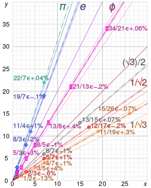 أفضل تقريبات كسرية لـ π (دائرة خضراء)، e (معيّن أزرق)، ϕ (مستطيل وردي)، (√3)/2 (مسدس رمادي)، 1/√2 (مثمن أحمر) و 1/√3 (مثلث برتقالي) محسوبين من التوسع المتواصل لكسورهم، موَقـَّعين كـميول y/x بأخطاء من قيَمهم الحقيقية (خطوط متقطعة سوداء)