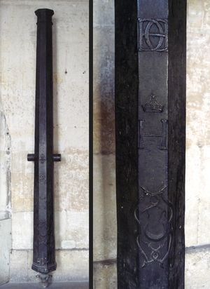 "Bastard culverin" of 1548, with arms of Henri II and Catherine de Medicis and crescent of ديان دى پواتييه. Caliber: 85mm, length: 300cm, weight: 1076kg.