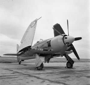 - Single-seat fighter version for the Royal Navy, 50 built by Hawker, an order for a further 300 placed at the same time to be built by Boulton Paul was cancelled. First production aircraft flew on 15 August 1946.[71][72]