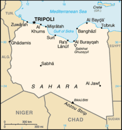 وحدة:Location map/data/Libya is a location map definition used to overlay markers and labels on an equirectangular projection map of ليبيا. The markers are placed by latitude and longitude coordinates on the default map or a similar map image.