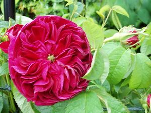 The Portland roses were long thought to be the first group of crosses between China roses and European roses, and to show the influence of Rosa chinensis. Recent DNA analysis however has demonstrated that the original Portland Rose has no Chinese ancestry, but has an autumn damask/gallica lineage.[27] This group of roses was named after the Duchess of Portland who received (from Italy about 1775) a rose then known as R. paestana or 'Scarlet Four Seasons' Rose' (now known simply as 'The Portland Rose'). The whole class of Portland roses was developed from that one rose. The first repeat-flowering class of rose with fancy European-style blossoms, the plants tend to be fairly short and shrubby, with a suckering habit, with proportionately short flower stalks. The main flowering is in the summer, but intermittent flowers continue into the autumn. Examples: 'James Veitch', 'Rose de Rescht', 'Comte de Chambord'.