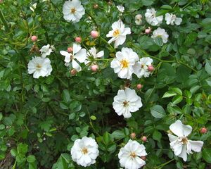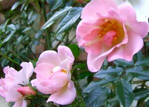 Although they arose too late to qualify technically as old garden roses, the hybrid musks are often informally classed with them, since their growth habits and care are much more like the old garden roses than modern roses. The hybrid musk group was mainly developed by Rev. Joseph Pemberton, a British rosarian, in the first decades of the 20th century, based upon 'Aglaia', an 1896 cross by Peter Lambert. A seedling of this rose, 'Trier', is considered to the foundation of the class.[14] The genetics of the class are somewhat obscure, as some of the parents are unknown. Rosa multiflora, however, is known to be one parent, and Rosa moschata (the musk rose) also figures in its heritage, though it is considered to be less important than the name would suggest. Hybrid musks are disease-resistant, repeat flowering and generally cluster-flowered, with a strong, characteristic "musk" scent.[34] The stems tend to be lax and arching, with limited thorns.[22] Examples include 'Buff Beauty' and 'Penelope'.