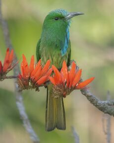The species appears to feed mainly on bees.[13] It exploits the defensive behavior of Giant honey bee (Apis dorsata) colonies by provoking the mass release of guard bees which are then caught in the air and eaten as they pursue the bird.[24] Although mainly foraging using aerial sallies, it is known to sometimes glean from bark.[25] They may sometimes associate with mixed-species foraging flocks.[26] Birds have been seen at flowers of Erythrina and Salmalia although it is unclear whether they fed on nectar or insects attracted to the flowers.[22]