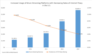 ازدادت شعبية منصات بث الموسيقى بسرعة في السنوات الأخيرة. لدى Spotify أكثر من 207 مليون مستخدم ، اعتبارًا من 1 يناير 2019 ، في 78 دولة مختلفة,[41] لدى Apple Music حوالي 60 مليون ، ولدى SoundCloud 175 million.[42] توفر جميع الأنظمة الأساسية درجات متفاوتة من إمكانية الوصول. تقدم Apple Music و Prime Music خدماتهما فقط للمشتركين المدفوعين ، في حين تقدم Spotify و SoundCloud خدمات مجانية ومتميزة. عادت Napster ، المملوكة لشركة Rhapsody منذ عام 2011 ، إلى الظهور كمنصة تدفق موسيقى تقدم خدمات قائمة على الاشتراك لأكثر من 4.5 مليون مستخدم اعتبارًا من يناير 2017.[43] مع تكاثر موفري بث الموسيقى ودفع المنافسة سعر الاشتراكات للأسفل ، انخفضت أيضًا معدلات قرصنة الموسيقى (انظر الرسم البياني إلى اليمين).
