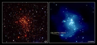 The cluster contains a large number of rare, evolved, high-mass stars, including: 6 yellow hypergiants, 4 red supergiants including Westerlund 1-26, one of the largest known stars, 24 Wolf-Rayet stars, a luminous blue variable, many OB supergiants, and an unusual supergiant sgB[e] star which has been proposed to be the remnant of a recent stellar merger.[7] In addition, X-ray observations have revealed the presence of the anomalous X-ray pulsar CXO J164710.2-455216, a slow rotating neutron star that must have formed from a high-mass progenitor star.[8] Westerlund 1 is believed to have formed in a single burst of star formation, implying the constituent stars have similar ages and compositions.