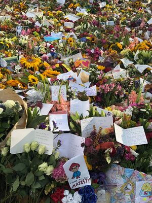 On 15 September, the Prince and Princess of Wales travelled to Norfolk to view tributes outside Sandringham House and meet members of the public.[139] The Earl and Countess of Wessex and Forfar did the same at St Ann's Square, Manchester Central Library, and Manchester Cathedral,[140] while the Princess Royal and Sir Timothy Laurence viewed tributes at the Glasgow City Chambers and met with well-wishers at George Square.[141]