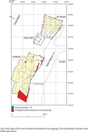 Plan of Old Izki al-Yemen, al-Nizar and the Yaruba fort between them. The red colour shows stone outcroppings. The blue shows the four trenches excavated in 2011.
