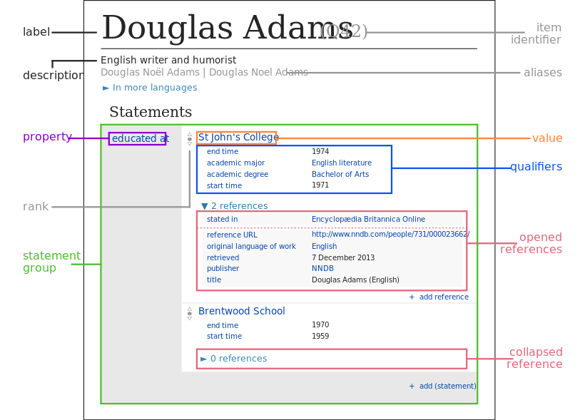 يتم إضافة المعلومات عبر عمل بيانات بشكل خاص. تأخذ البيانات الصيغة المعروفة بزوج المفتاح والقيمة (key-value pairs)، والتي تحتوي على الخاصية (المفتاح) والقيمة المرادفة للخاصية. في الصورة المُرفقة لدوغلاس آدمز نشاهد إحدى الخواص وهي مكان الدراسة (educated at) والقيمة لها تكون هي الجواب، أي اسم المكان الذي درَس فيه آدمز وهي كلية سانت جونز، كمبردج كما في الصورة. أيضا تندرج مُعَرفات قيمة إضافية (qualifiers) مثل وقت بداية الدراسة ونهايتها، بالإضافة للمراجع لتلك المُعَرفات.