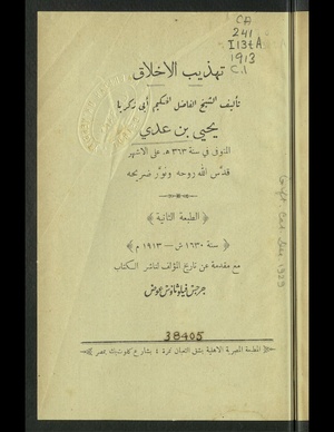 1 | كتاب تهذيب الأخلاق | مطبوع | اُختلف في كاتبه فنسب للجاحظ، وابن عربي، ويحيى بن عدي، وابن الهيثم. والأقرب أنه الأخير كما بين ذلك محمد عابد الجابري في بحث له. |