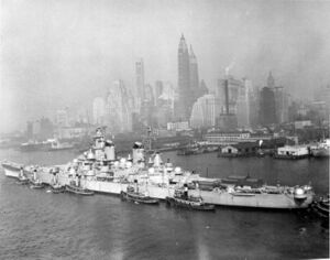 After west coast operations and a normal overhaul at Puget Sound, New Jersey came home to Bayonne, New Jersey, for a rousing fourth birthday party 23 May 1947. Present were Governor Alfred E. Driscoll, former Governor Walter E. Edge and other dignitaries.[8] Between 7 June and 26 August, New Jersey formed part of the first training squadron to cruise Northern European waters since the beginning of World War II. Over two thousand United States Naval Academy and NROTC midshipmen received seagoing experience under the command of Admiral Richard L. Connolly, Commander Naval Forces Eastern Atlantic and Mediterranean, who broke his flag in New Jersey at Rosyth, Scotland 23 June. She was the scene of official receptions at Oslo, where King Haakon VII of Norway inspected the crew 2 July, and at Portsmouth, England. The training fleet was westward bound 18 July for exercises in the Caribbean and Western Atlantic.[8]