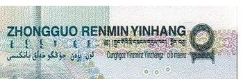 "بنك الشعب الصيني" مكتوب بخمس لغات مختلفة. من أعلى إلى أسفل، ومن اليسار لليمين: مندارين پنين، المنغولية، التبتية، الويغورية وژوانگ.
