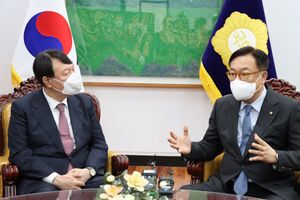 يون برفقة نائب رئيس الجمعية الوطنية في ذلك الوقت تشونگ جين-سوك في نوفمبر 2021.