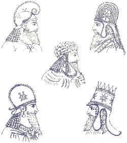 أنواع مختلفة من القبعات الرسمية الپارثية التي كانت تستخدم في لقاءات العامة بالنبلاء. الطراز خليط من طرز الملابس الفارسية واليونانية. تيارا أرمنية تظهر في الركن الأسفل الأيمن.