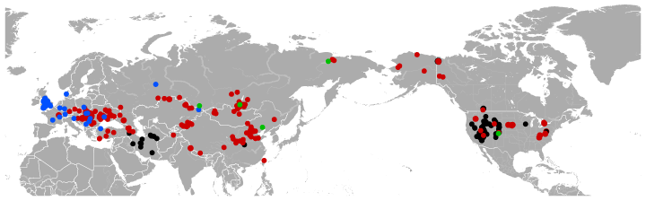 Many fossil forms of Ochotona are described in the literature, from the Miocene epoch to the early Holocene (extinct species) and present (16.4-0 Ma[1]). They lived in Europe, Asia, and North America.Some species listed below are common for Eurasia and North America (O. gromovi, O. tologoica, O. zazhigini, and probably O. whartoni).