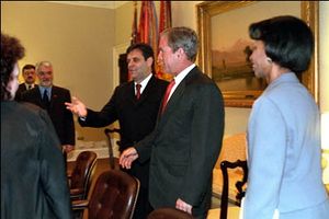 President George W. Bush greets Vojislav Koštunica, then President of Yugoslavia, in White House.