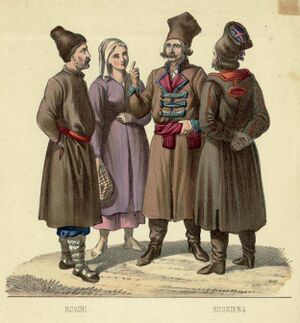 Galicia had arguably the most ethnically diverse population of all the countries in the Austrian monarchy, consisting mainly of Poles and "Ruthenians";[12] the peoples known later as Ukrainians and Rusyns, as well as ethnic Jews, Germans, Armenians, Czechs, Slovaks, Hungarians, Roma and others. In Galicia as a whole, the population in 1910 was estimated to be 45.4% Polish, 42.9% Ruthenian, 10.9% Jewish, and 0.8% German.[13] This population was not evenly distributed. The Poles lived mainly in the west, with the Ruthenians predominant in the eastern region ("Ruthenia"). At the turn of the twentieth century, Poles constituted 88% of the whole population of Western Galicia and Jews 7.5%. The respective data for Eastern Galicia show the following numbers: Ruthenians 64.5%, Poles 22.0%, Jews 12%.[14][15] Of the 44 administrative divisions of Austrian eastern Galicia, Lviv (پولندية: Lwów, ألمانية: Lemberg) was the only one in which Poles made up a majority of the population.[16] Anthropologist Marianna Dushar has argued that this diversity led to a development of a distinctive food culture in the region.[17]