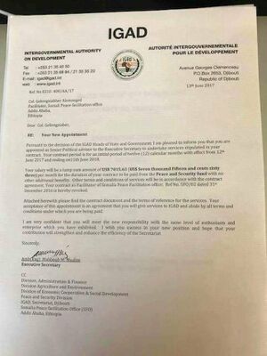 عام 2017، حصل الجنرال گبرىإگزيأبحر، وهو ليس جنرالاً، على ترقية من إيگاد كمستشار سياسي كبير لمكتب "تيسير السلام في الصومال" التابع للمنظمة. من مقره في مكتب إيگاد في منطقة بولى بالعاصمة أديس أبابا، حصل على راتب شهري قدره 7015.63 دولارًا أمريكيًا مقابل عمله.