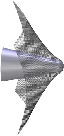 مثال الگرافين الكامل يتألف حصرا من خلايا سداسية وأما الخلايا الخماسية والسباعية فتشكل عيوباً. إذا وجدت خلية خماسية معزولة، ثم يلتف المستوى متحولا إلى مخروط الشكل؛ وبإدخال 12 تركيباً خماسيا من شأنه أن يخلق الفولرين. بالمثل إدراج جزىء سباعي معزول يتسبب في تكوين مسطح يشبه السرج. وبإضافة أشكال خماسية مع أشكال سباعية من شأنه أن يسمح لطائفة واسعة من الأشكال المعقدة أن تتم، على سبيل المثال الكربون نانوبد هو من الأنابيب الجزيئية الكربونية وحيدة الجدار ويمكن اعتبارها من أسطوانات الگرافين؛ بعضها لديها الگرافين بشكل القبعة نصف الكروية (التي تضم 6 أشكال خماسية) في كل نهاية.