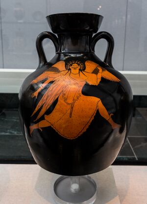 Consistent with the change in literary descriptions seen in the works of Pindar and Ovid mentioned above, beginning in the fifth century BC, representations of Gorgons and gorgoneia transition from hideous monsters to beautiful young women, with such representations becoming typical in the fourth century BC.[59] One of the earliest such "beautiful" Gorgons (mid-fifth century BC) is a red-figure pelike (Fig. 11), which shows Perseus, with head turned away, about to behead a sleeping Medusa.[60] While gorgoneia continue to be ubiquitous through the end of antiquity, after the fourth century BC full-bodied Gorgons ceased to be represented.[61]