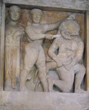 Full-bodied Gorgons are usually shown in connection with the Perseus-Medusa story.[62] The earliest representations (mid-seventh century BC) of such Gorgons are a Boeotian relief pithos (Fig. 1), which depicts Perseus, with head turned away, decapitating a Gorgon, and the Eleusis Amphora (Fig. 2), which shows two Gorgons chasing Perseus fleeing with a severed Gorgon head. That the Perseus on the pithos averts his gaze shows that already in these earliest images it was understood that looking directly at the Gorgon's face was deadly.[63] Of particular interest is the famous Medusa pediment (early sixth century BC) from the temple of Artemis in Corfu (Fig. 6), which shows a winged-Medusa in the characteristic Knielauf (kneeling-running) position, with two snakes wrapped around her waist, like the Gorgons described in the Hesiodic Shield of Heracles.[64]