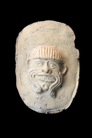 The gorgonesque votive masks from Sparta have deep S-shaped furrows on either side of wide-mouthed grimaces. Such features resemble those on the much earlier terracotta plaques depicting Humbaba.[113]