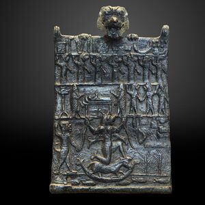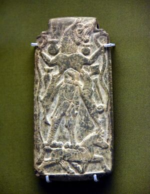 It is possible that the mythology and/or the iconography of Gorgons were subject to Near-Eastern influence.[97] In particular elements of full-bodied Gorgon iconography seem to have been borrowed from that of the Mesopotamian Lamashtu.[98] Mesopotamian depictions of Gilgamesh slaying Humbaba, may have influenced the Perseus-Gorgon story, while gorgoneia may be connected to images of Humbaba.[99]