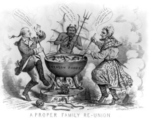 وفاة الجنرال بنديكت أرنولد (1741-1801) الذي سلّم للبريطانيين الجيش القاري أثناء الحرب الثورية الأمريكية. الكاريكاتير لأرنولد (يسار) في الجحيم مع الرئيس الكونفدرالي جفرسون ديڤس (يمين)؛ 1865)