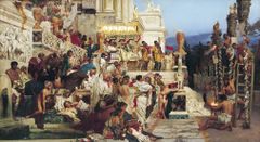 حريق روما الكبير (AD64). لوحة خنريك سيميرادزكي لوحة "مشاعل نيرون" (1876). نيرون يأمر بحرق مجموعة من المسيحيين الأوائل بتهمة إشعال الحريق.