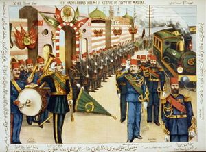 الخديوي الحاج عباس حلمي الثاني يصل بالقطار إلى المدينة المنورة. ويظهر في الصورة القطار وباب العنبرية، عام 1329 هـ/1911م. بريشة الفنان الحجازي حسين ميمش. وقد سجل المؤلف البتنوني تفاصيل رحلة الحج تلك في كتاب الرحلة الحجازية.