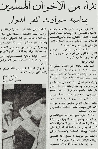 نداء من الإخوان المسلمين بمناسبة حوادث كفر الدوار - جريدة المصري الوفدية في 15 أغسطس 1952.