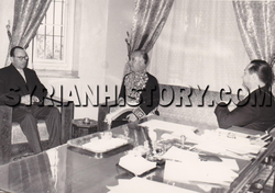 السفير التركي في دمشق في غرفة الإنتظار قبل تقديم أوراق اعتماده للرئيس شكري القوتلي عام 1956. السفير التركي يجلس في ضيافة السيد فؤاد الحلبي ، مدير مكتب الرئيس القوتلي (يسار) ومقابله السيد وليد ماجد أمين عام وزارة الخارجية السورية. المصدر: مكتبة السيد طلال سكر