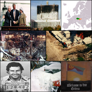 From left, clockwise: The Oslo I Accord is signed in an attempt to resolve the Israeli–Palestinian conflict; The Russian White House is shelled during the 1993 Russian constitutional crisis; Czechoslovakia is peacefully dissolved into the Czech Republic and Slovakia; In the United States, the ATF besieges a compound belonging to David Koresh and the Branch Davidians in a search for illegal weapons, which ends in the building being set alight and killing most inside; Eritrea gains independence; A major snow storm passes over the United States and Canada, leading to over 300 fatalities; Drug lord and narcoterrorist Pablo Escobar is killed by Colombian special forces; Ramzi Yousef and other Islamic terrorists detonate a truck bomb in the subterranean garage of the North Tower of the World Trade Center in the United States.