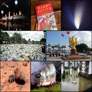 من اليسار، مع عقارب الساعة: movie set of Titanic, the highest-grossing movie in history at the time; Harry Potter and the Philosopher's Stone, is published; Comet Hale-Bopp passes by Earth and becomes one of the most observed comets of the 20th century; Golden Bauhinia Square, where sovereignty of Hong Kong is handed over from the United Kingdom to the People's Republic of China; the 1997 Central European flood kills 114 people in the Czech Republic, Poland, and Germany; Korean Air Flight 801 crashes during heavy rain on Guam, killing 229; Mars Pathfinder and Sojourner land on Mars; flowers left outside Kensington Palace following the death of Diana, Princess of Wales، في حادث سيارة في پاريس.