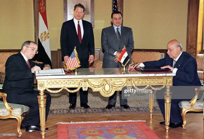 الرئيس المصري حسني مبارك ونائب الرئيس الأمريكي آل گور (الثاني من اليسار) يشاهدان وزير العدل المصري فاروق سيف النصر والسفير الأمريكي بالقاهرة دانيال كرتسر يوقعان اتفاقيات للتعاون في مكافحة الإرهاب والجريمة المنظمة ولرفع المعونة الأمريكية للشركات الصغيرة. القاهرة، 3 مايو 1998.