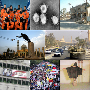 From top left, clockwise: The crew of STS-107 perished when the Space Shuttle Columbia disintegrated during reentry into Earth's atmosphere; SARS became an epidemic in China, and was a precursor to SARS-CoV-2; A destroyed building in Bam, Iran after the 2003 Bam earthquake killed 30,000 people; A U.S. Army M1 Abrams tank patrols the streets of Baghdad after the city fell to U.S.-led forces; Abuse and torture of Iraqi prisoners at Abu Ghraib prison by U.S. personnel; Protests in London against the Invasion of Iraq; "Mission Accomplished" became an ironic symbol of the protractedness of the Iraq War after President George W. Bush's infamous speech; a statue of Saddam Hussein is toppled in Baghdad after his regime was deposed during the Iraq War.