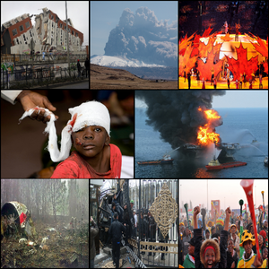 From top left, clockwise: The 2010 Chile earthquake was one of the strongest recorded in history; The Eruption of Eyjafjallajökull in Iceland disrupts air travel in Europe; A scene from the opening ceremony of the 2010 Winter Olympics in Vancouver, British Columbia, Canada; The Deepwater Horizon drilling rig explosion and subsequent oil spill becomes the worst marine oil spill in history; Spectators watch a football match with their famous vuvuzelas during the 2010 FIFA World Cup, which was held in South Africa; people entering the White House in Bishkek on 7 April during the Kyrgyz Revolution of 2010; the remains of Tu-154 after crash on April 10, 2010 that killed Polish president Lech Kaczyński; a child is treated for injuries following 2010 Haitian earthquake which killed an estimated 100,000 - 250,000 people.