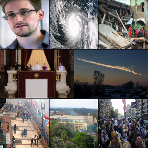 من اليسار، مع عقارب الساعة: Edward Snowden becomes internationally famous for leaking classified NSA wiretapping information; Typhoon Haiyan kills over 6,000 in the Philippines and Southeast Asia; The Dhaka garment factory collapse in Bangladesh kills over 1,000 people; The streak from the Chelyabinsk meteor that rocketed across the Russian morning sky; Protests occur amid the coup d'état that overthrew President Mohamed Morsi of Egypt; Smoke rises as a result of the Westgate shopping mall attack in Nairobi, Kenya, carried out by Al-Shabaab militants; The Boston Marathon bombing marks the first terrorist attack in the United States since 9/11; Pope Francis is elected to the Papacy in the 2013 papal conclave.