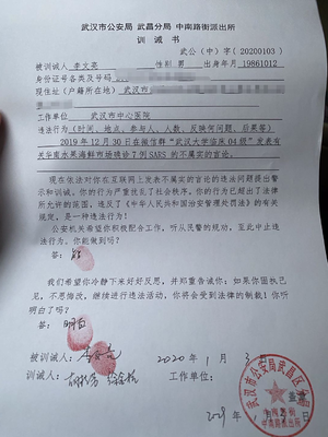 Document issued by the Wuhan Police ordering Li Wenliang to stop "spreading rumours" about a possible 'SARS virus' dated 3 January.
