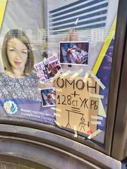 Minsk, 15 August. Makeshift board with photographs and a drawing of hanged OMON forces condemns the death of Aliaksandar Tsaraikouski