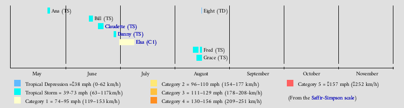 Tropical Storm Ana formed ten days before the official start of the 2021 Atlantic hurricane season, making 2021 the seventh consecutive year in which a tropical or subtropical cyclone formed before the season's official start on June 1. Ana formed in a location where no tropical storms within the month of May had been documented since before 1950.[26] In mid-June, a rapidly developing non-tropical low offshore of the North Carolina coast became Tropical Storm Bill. The system lasted for only two days before becoming extratropical. Later that month, Tropical Storm Claudette formed on the coast of Louisiana and Tropical Storm Danny formed off the coast of South Carolina.