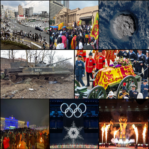 مع عقارب الساعة، من أعلى اليسار: تقاطع طرق في محطة ياماتو-سايدايجي بعد ساعات من اغتيال شنزو آبى؛ المظاهرات المناهضة للحكومة في سري لانكا أمام أمانة الرئاسة؛ Hunga Tonga–Hunga Haʻapai volcano يثور، making it the most powerful volcanic eruption of the 21st century؛ The state funeral procession of الملكة إليزابث الثانية of the United Kingdom; Opening ceremony of the 2022 FIFA World Cup في قطر؛ Opening ceremony of the 2022 Winter Olympics في بكين، China؛ الاحتجاجات في ألماتي أثناء فترة القلاقل في قزاقستان؛ ناقلة جنود BMP-3 روسية بالقرب من ماريوپول تقبع مُدمَرة أثناء الغزو الروسي لأوكرانيا 2022.