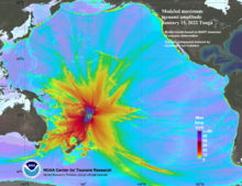 A 2022 study in the journal Ocean Engineering by Heidarzadeh and others determined the size of the initial tsunami caused by the eruption. The study analyzed data from 22 tide gauges, eight Deep-ocean Assessment and Reporting of Tsunamis (DART) stations, eight atmospheric pressure time series, spectral analysis and computer simulation. It was concluded that the eruption displaced 6.6 km3 of seawater, 90 m (300 ft) in amplitude, with a length of 12 km (7.5 mi).[70] The displacement generated a number of waves in the atmosphere, including lamb waves in the troposphere and gravity waves in higher layers of the atmosphere, which propagated around the world at speeds close to the speed of sound.[71]
