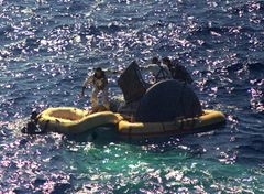 - 1965 - The spacecraft Gemini 5 , on board the two astronauts Gordon Cooper and Charles Conrad , returns after a long-term record of 8 days in space and 120 orbits back to Earth and Wassert Atlantic.