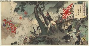 1894: الحرب الصينية اليابانية: معركة سونگهوان. لوحة بأسلوب أوكييو-إ بريشة Mizuno Toshikata Akiyama Buemon. "هجوم! هجوم! تحيا إمبراطورية اليابان العظمى! النصر لجنودنا في هجومهم على سونگهوان، بتاريخ أغسطس 1894 (مـِيْجي 27)