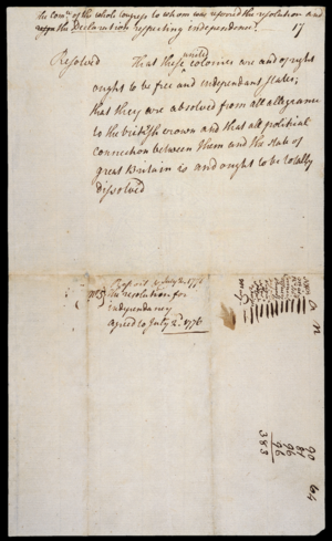 "القرار بالاستقلال اِتـُفِق عليه في 2 يوليو 1776". العلامات في أسفل اليمين تبين 12 مستعمرة صوتت لصالح الاستقلال. مقاطعة نيويورك امتنعت عن التصويت.