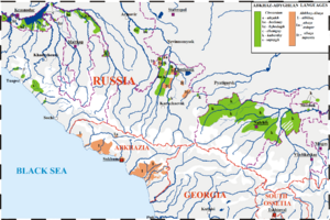 In some form or the other, all dialects are richer in phonemes than the standard Abzhywa dialect.[40] The only dialects spoken in Abkhazia are Abzhywa and Bzyp. Northern dialects which are the basis for literary Abaza are spoken in Karachay-Cherkessia, while the other dialects such as Sadz are spoken in Turkey due to Russian invasions in the 19th century.[41][42][43] While most differences are phonetic, differences in the lexicon are present, although mostly due to exterior contact.[44] Bzyp contains the most preserved lexicon, with few borrowings. Abzhywa has adopted many loans from Kartvelian, specially Mingrelian; Sadz on the other hand has more words from Circassian. Northern dialects in general have more loanwords from Persian, Arabic, Turkish and Circassian.