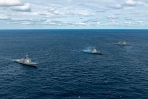On 6 October 2022, five warships from the United States, Japan, and South Korea held a multilateral ballistic missile defense exercise in the Sea of Japan (pictured) as part of the military response to ongoing North Korean intermediate-range ballistic missile tests over the Japanese home islands.[33][34]